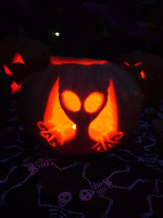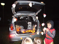 This evening, as I mentioned earlier, we were invited to a Trunk or Treat party at husband’s office. We were unsure of what to expect, we had been told to bring sweets for the trick or treating, pumpkins for a best pumpkin competition and decorations for the car. In typical European fashion, I took some pumpkins and a couple of squashes as decorations, only to be completely outshined by the American colleagues with their halloween lights, fake ghosts and cobwebs. The winning alien pumpkin was fabulous, and certainly deserved to win. There was some controversy over the second pumpkin as it was open at the bottom which many felt was cheating. 🙂